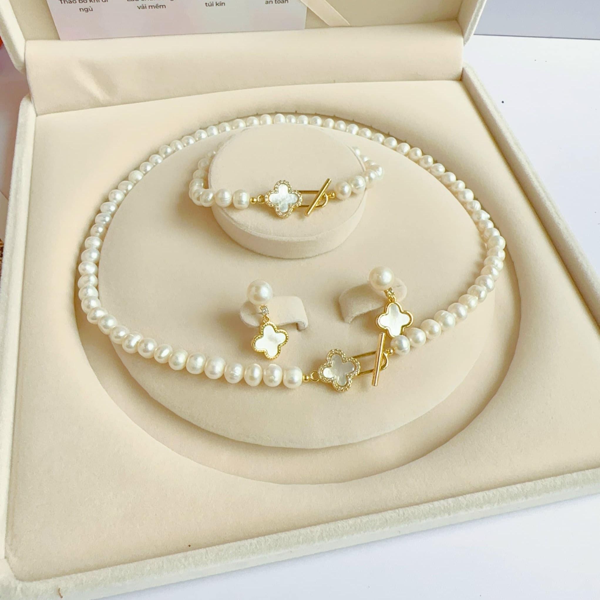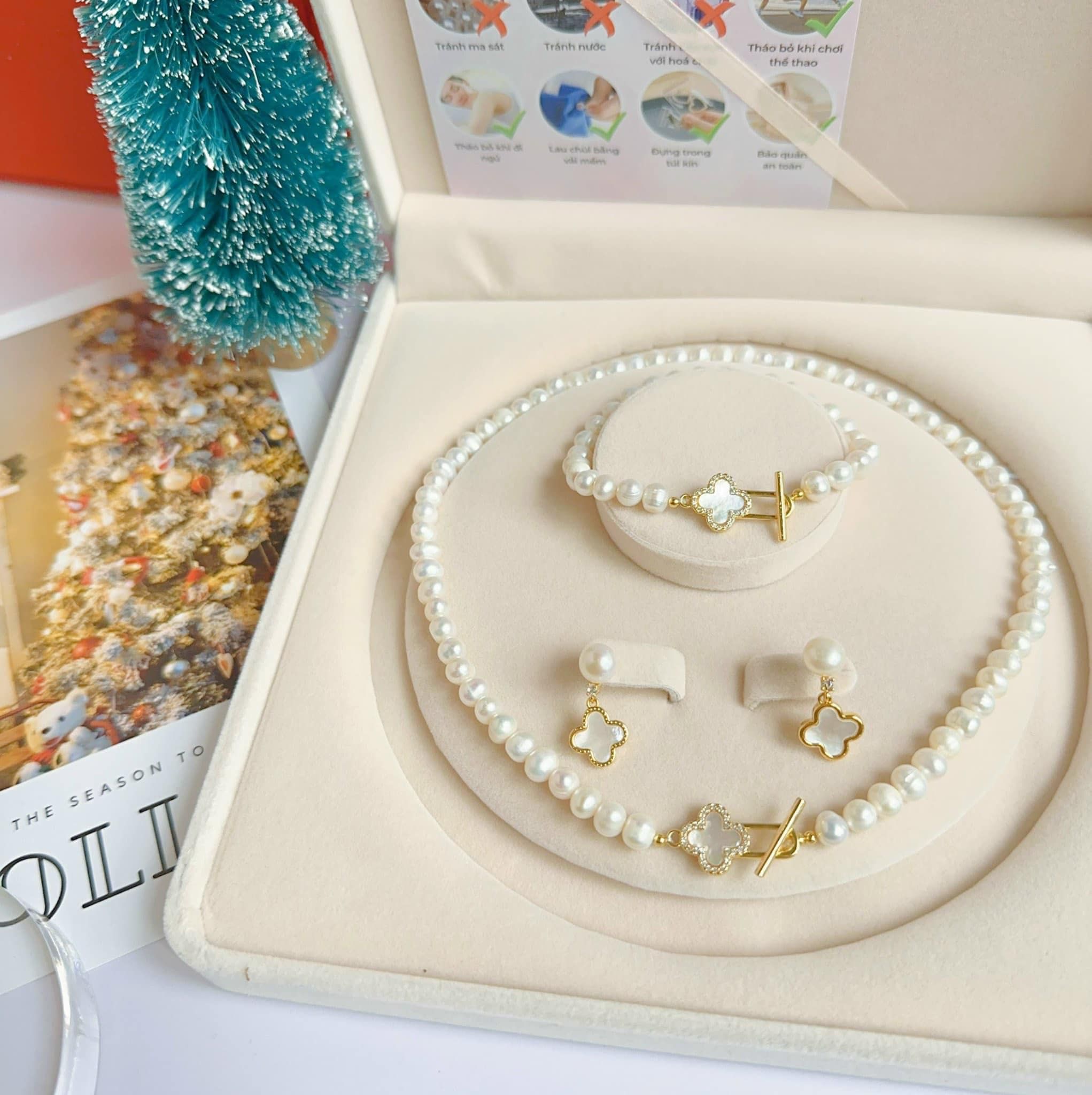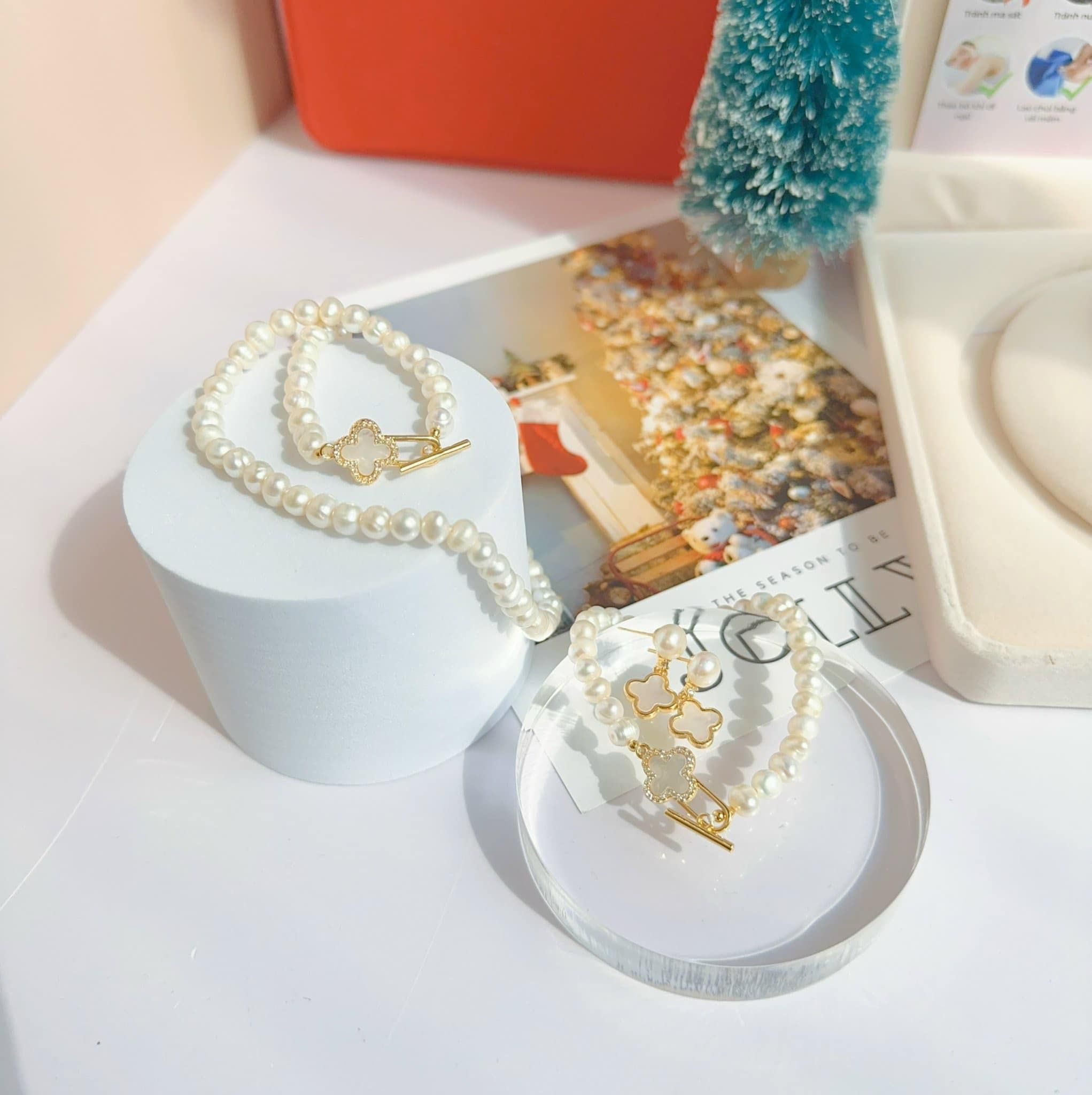 Bộ 4 món trang sức vòng cổ, vòng tay, khuyên tai, nhẫn ngọc trai four-leaf clover