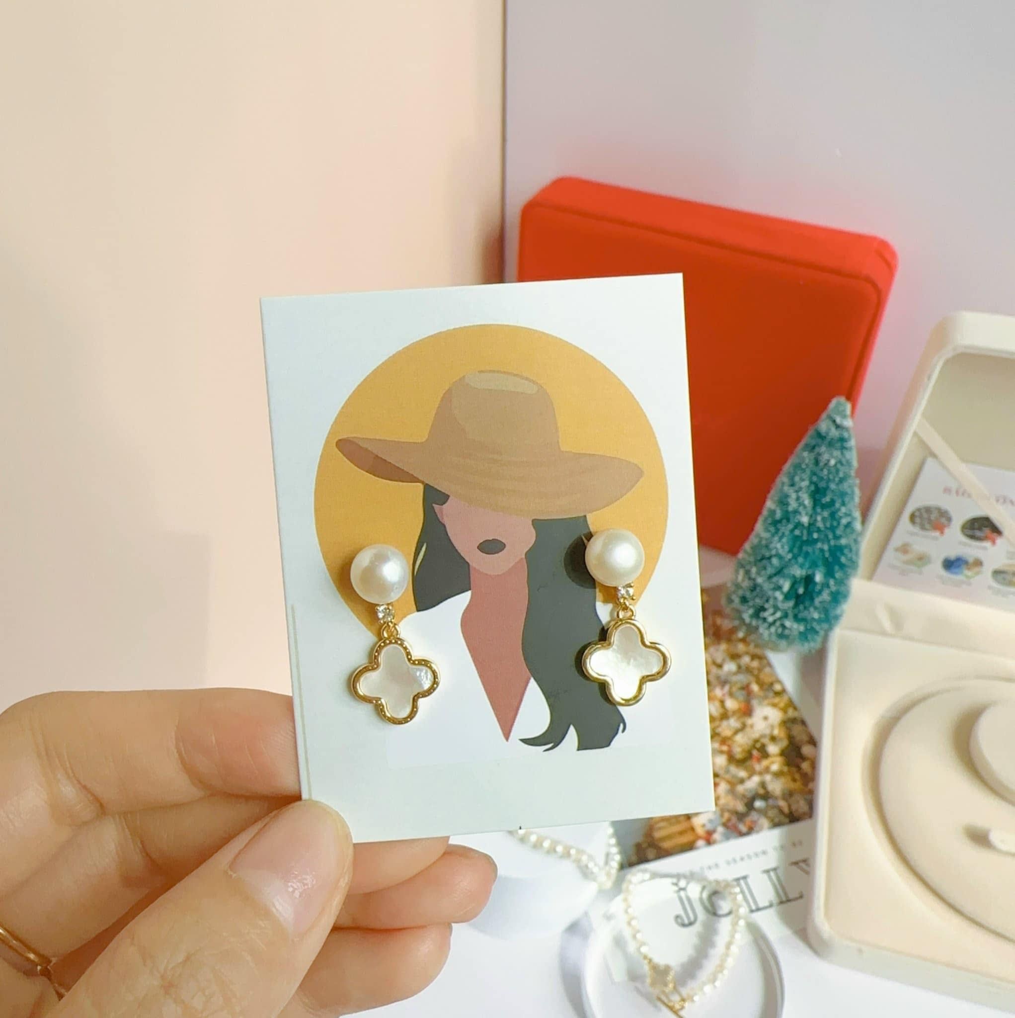 Hình ảnh cỏ bốn lá được khảm đá trên ngọc trai, tạo nên một thiết kế độc đáo và bắt mắt. Ngọc trai thường được liên kết với sự thuần khiết và quý phái, làm tôn lên giá trị của bộ trang sức.