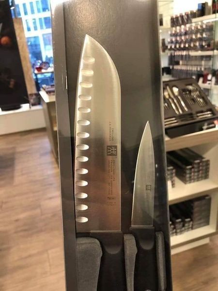 - SANTOKU nghĩa là 3 trong 1, thái gọt thịt+rau+củ quả, là mẫu dao tiện dụng vì cắt được mọi thứ. Chiều dao lưỡi dao 18cm, có độ cân bằng tốt. Các tính năng đặc biệt của Santoku là lưỡi mỏng với cạnh hình nêm. Cực kỳ linh hoạt, tiện sử dụng cho mọi mục đích, thái gọt cứ nuốt nuột, chẳng mất hơi, tốn sức. Ngoài ra trên lưỡi có các lỗ khí để chống bám dính khi cắt thái (cho những đồ như bơ, pho mát...). Vì thế ngày nay, bất kỳ đầu bếp nổi tiếng nào trên thế giới cũng sở hữu 1 bạn SANTOKU trong ngăn kéo tủ bếp