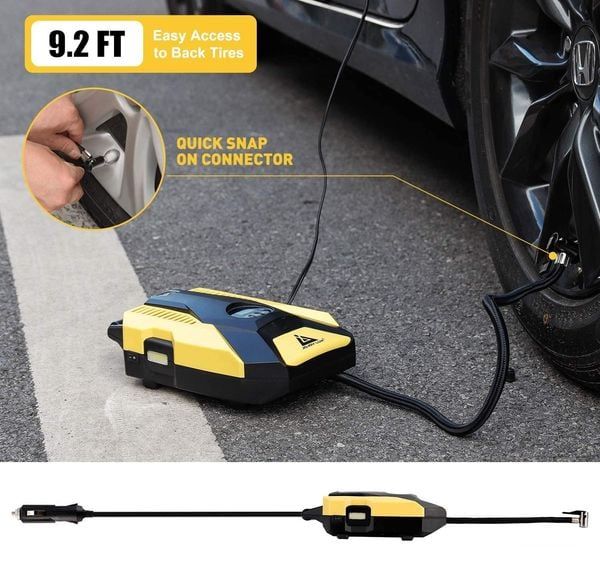 Sử dụng dễ dàng: Chỉ cần cắm một đầu vào nguồn điện 12V trên xe, đầu còn lại kết nối với van trên lốp xe, ấn nút, bơm sẽ chạy tự động