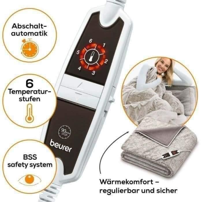 Hệ thống điện BSS của Beurer đảm bảo an toàn tuyệt đối. Điều khiển nhiệt độ được điều chỉnh để mang đến cảm giác ấm nhẹ, dễ chịu. Dây dẫn được bọc nhiều lớp, ngăn chặn giò rỉ điện và hạn chế từ trường.