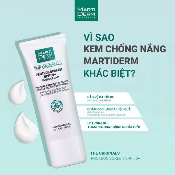 Kem Chống Nắng MartiDerm The Originals Proteos Screen SPF50+ Fluid Cream kem chống nắng dạng lỏng dễ hấp thụ với chỉ số SPF 50+ giúp ngăn ngừa và sửa chữa các dấu hiệu lão hoá da sớm. Sản phẩm cung cấp màng lọc chống nắng phổ rộng chống lại các tia UVA, UVB, IR (hồng ngoại), HEV (ánh sáng xanh). Sự kết hợp của Proteoglycans, phức hợp Spectrum Complex, phức hợp Hyaluronic Acid & Silicon Complex giúp giữ cho làn da trẻ trung, tươi tắn và đều màu. Kết cấu dạng cream-to-powder độc đáo mang lại cảm giác mượt mà, mỏng nhẹ tựa "vô hình" trên da, lý tưởng dành cho mọi loại da khi sử dụng hằng ngày nhờ các ưu điểm tuyệt vời sau: