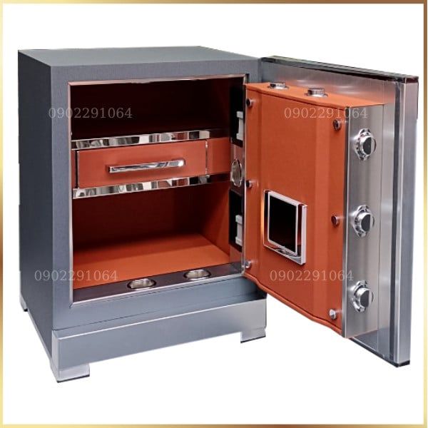 - Cấu tạo: Thép đúc nguyên tấm dày 8 ly, cánh két sắt thép dày 10 ly, có có bo nhôm xung quanh