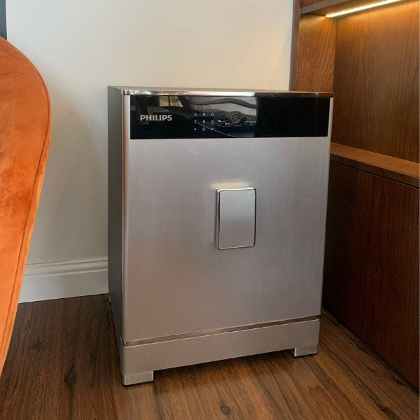 Két sắt Philips SBX701-4B0 không chỉ mạnh về tính năng mà còn được đánh giá cao về mặt thẩm mỹ. Thiết kế liền khối vững chãi với hai màu xám và bạc sang trọng, cùng với nội thất bọc da PU cao cấp và viền kim loại sáng bóng, sản phẩm không chỉ là một két sắt thông thường mà còn là một món đồ trang trí đẳng cấp cho ngôi nhà của bạn.
