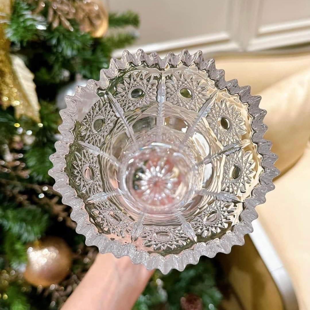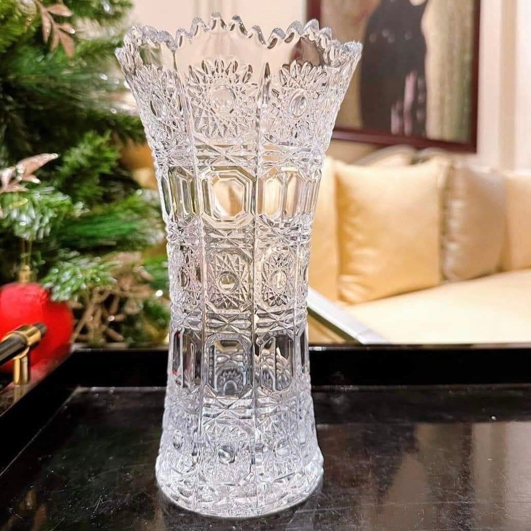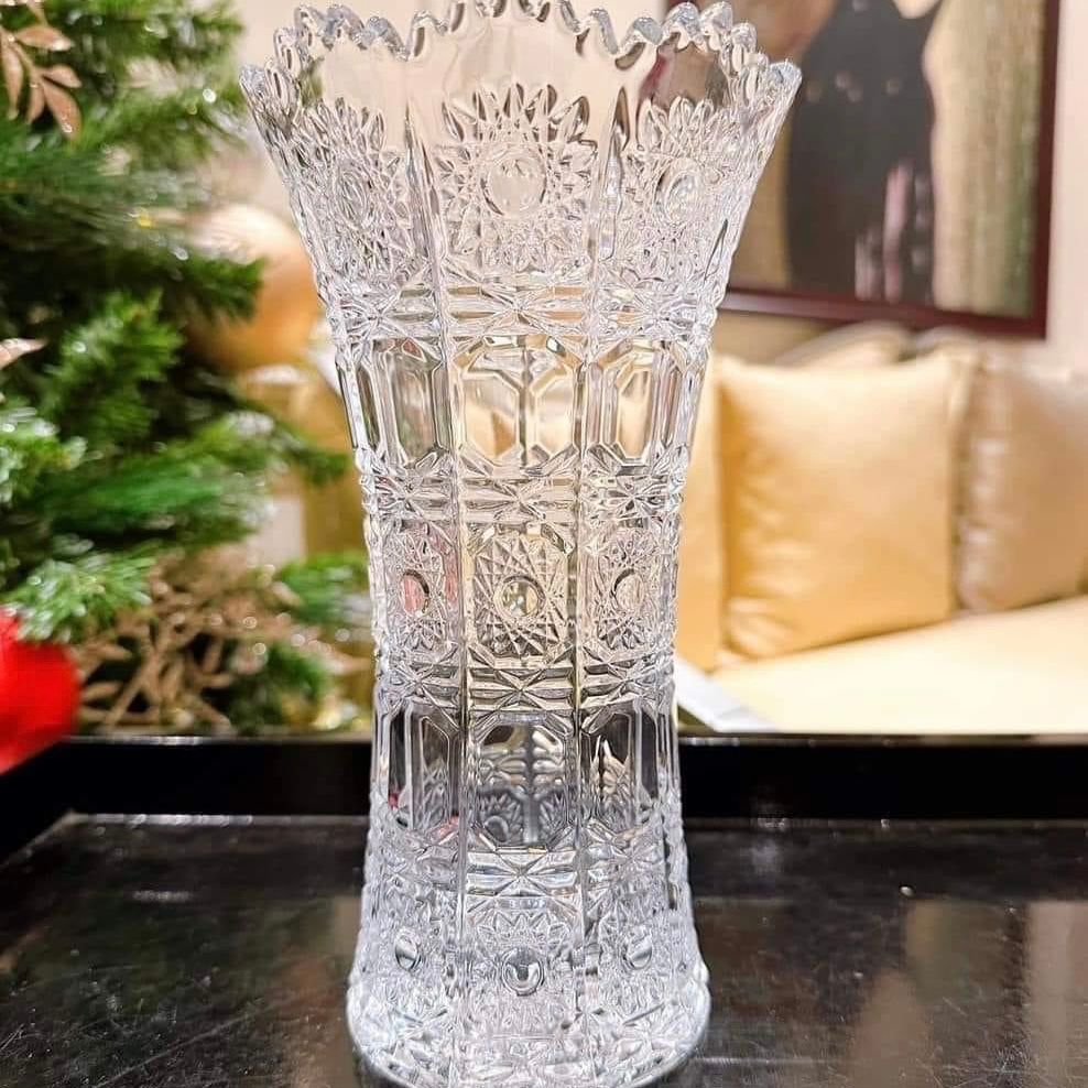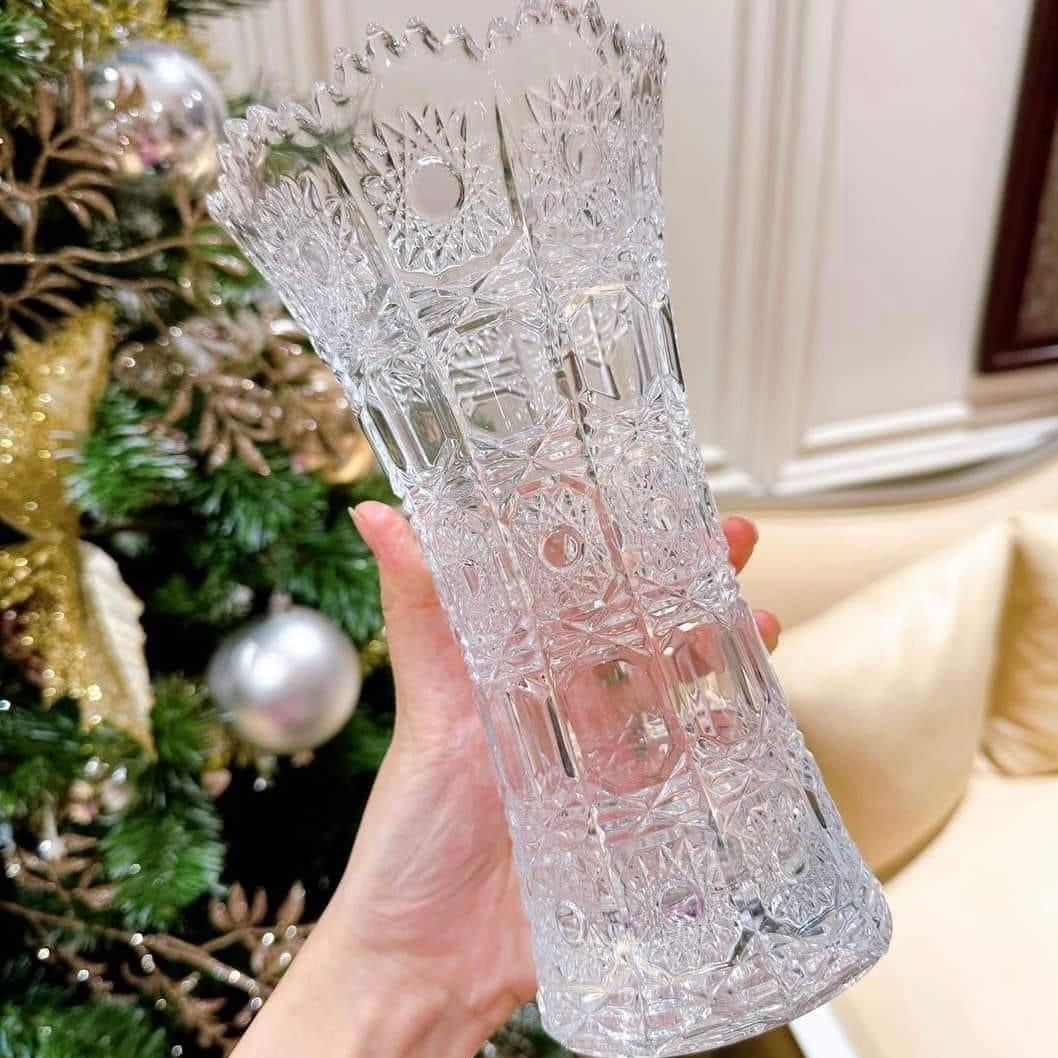 Điểm nhấn nổi bật nhất của bình hoa này là các đường nét hoa văn được mài hoàn toàn bằng tay, làm cho chiếc bình có độ ánh quang cao, tạo thành tán sắc 7 màu lung linh, đẹp mắt và ấn tượng. Chính vì thế các dòng pha lê mài có giá thành sẽ gấp 1,5 lần so với pha lê thường hoặc pha lê trơn để các anh chị tiện phân biệt.