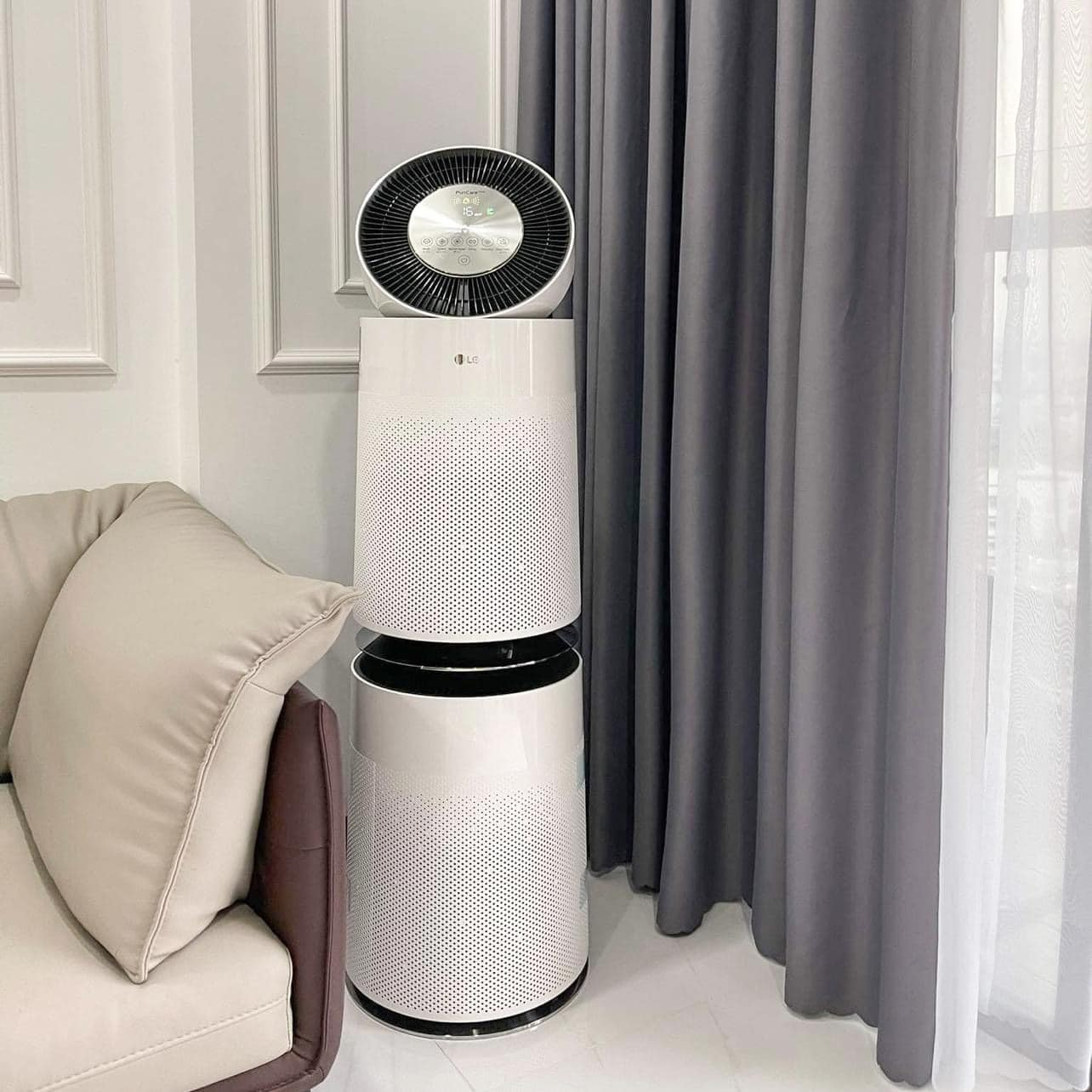 - Máy lọc không khí LG Puricare 360° 2 tầng, một sản phẩm tuyệt vời mang lại không khí trong lành cho em bé của bạn. Bạn có biết rằng mức độ ô nhiễm không khí cao nhất trong nhà là vị trí mà các bé hay chơi đùa? Với chế độ hoạt động chăm sóc em bé, máy lọc không khí LG Puricare 360° 2 tầng chỉ vận hành tầng dưới, mang không khí sạch đến những nơi thấp nhất để bé chơi.