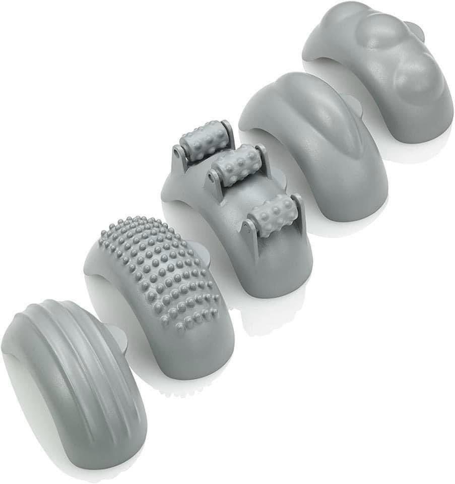 - 5 phần đính kèm: Năm phần đính kèm mát xa khác nhau được bao gồm trong máy mát xa cầm tay. Với điều này, các ứng dụng từ lĩnh vực bấm huyệt cũng như con lăn và xoa bóp điểm có thể được thực hiện