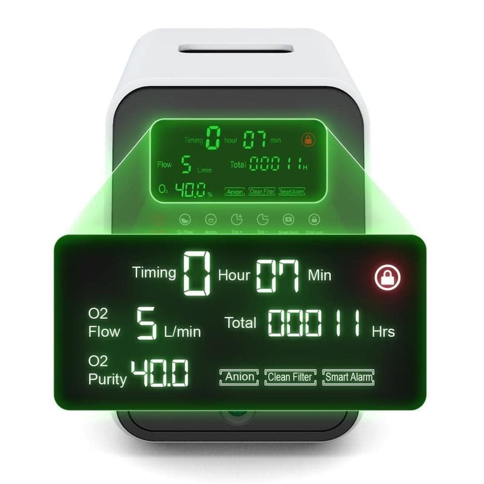 - Màn hình hiển thị thời gian, chỉ báo bật / tắt khóa trẻ em, tổng số giờ, tốc độ dòng chảy, độ tinh khiết oxy, chỉ báo cảnh báo thông minh, cảnh báo bộ lọc sạch và chỉ báo ion âm.