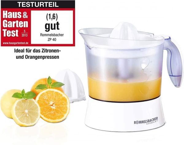 Máy vắt cam Rommelsbacher ZP40 của Đức công suất 230v-40W, máy nhỏ gọn nhưng cực hiệu quả, vắt kiệt nước, gồm 2 đầu vắt to nhỏ( dùng cho cả Chanh, Quýt và Cam)