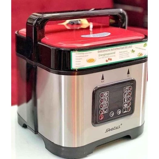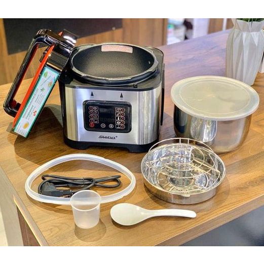 Nồi áp suất điện Steba với công suất 900W cùng 9 chế độ nấu tự động: hầm gân, hầm xương, hầm thịt, nấu cơm, cháo… giúp cho bạn chế biến các món ăn đơn giản và dễ dàng hơn. Ngoài chức năng tự động nấu, nồi còn được trang bị tính năng hẹn giờ và giữ ấm, tiện dụng hơn cho người dùng.