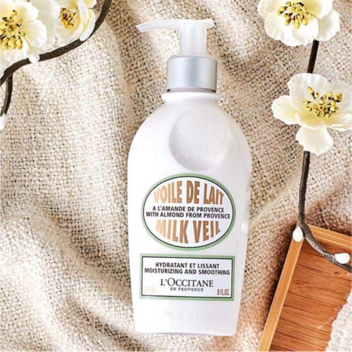 Sau khi tắm xong, thoa Sữa dưỡng thể hạnh nhân L’Occitan.e Almond Milk Veil đều lên da toàn thân và massage nhẹ nhàng để dưỡng chất hấp thụ hết vào da